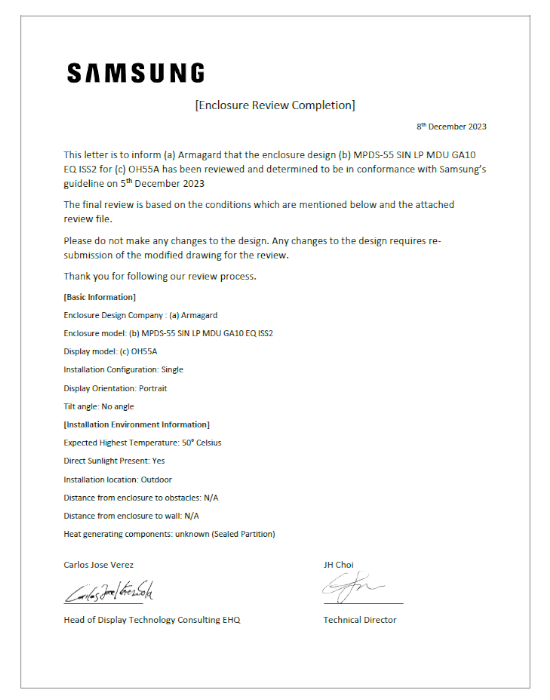 | Específicamente diseñado para la serie Samsung OH | Un soporte de pared o de pie de alta calidad hecho exclusivamente para su pantalla exterior Samsung. |