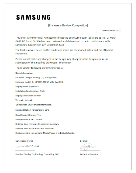 El soporte para Samsung OH46F y OH55F protege sus elementos de reproducción multimedia de amenazas externas mediante el control del flujo de aire, manteniéndolos constantemente refrigerados. Una clasificación de IP56 evita la entrada de líquidos y un recubrimiento resistente garantiza que las partículas en suspensión no puedan causar daños. Con una duración de hasta 10 años y una garantía de cinco, el tótem mejora enormemente el retorno de la inversión.